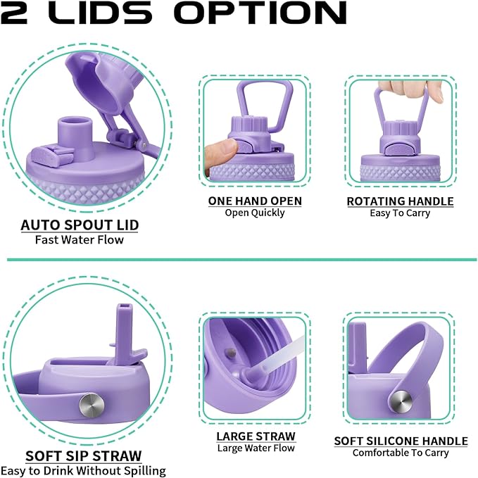 - 2 LIDS—100% Leak Proof: the auto spout cap & straw lid provide your different drinking experience. The ONE-HAND operation pop-up spout lid for convenient enjoy your fast water flow. The SPILL-PROOF straw lid with high flow rate & BPA free. Both 2 lids design with a sturdy handle, making the thermal water bottle more convenient to carry
