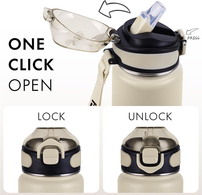 - One-Handed Use: Our flip top is designed to be opened with just one hand and a press of a button! The top is fitted with a silicone straw for sipping. Easy and convenient to use when exercising at the gym, driving, and even while riding your bike.