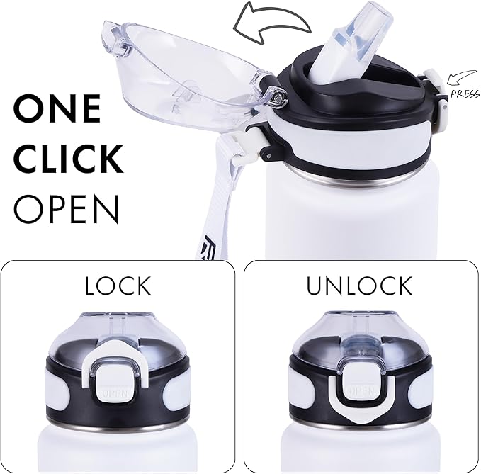 - One-Handed Use: Our flip top is designed to be opened with just one hand and a press of a button! The top is fitted with a silicone straw for sipping. Easy and convenient to use when exercising at the gym, driving, and even while riding your bike.