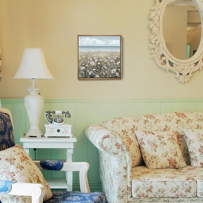 - ➤Bring a Beach Vibe to Your Space: This floral canvas print depicts a seashore covered with newly blooming wildflowers. The upper half of the canvas wall art features a blue sky and a calm ocean in pale blue and gray tones for a fresh and breezy look. The lower half of the artwork is covered in a neutral palette of white, cream, and brown to complete this coastal farmhouse piece.