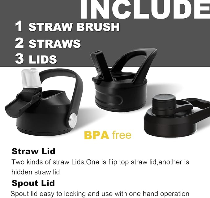 - Amazing water bottle with Lids:Straw water bottle 32 oz with 3 Lids - 2 style of flip-straw LIDs and 1 spout LID , 2 Straws Food Grade Silicone , 1 Straw brush.Great for indoor / outdoor sports and extremely happy as gift.