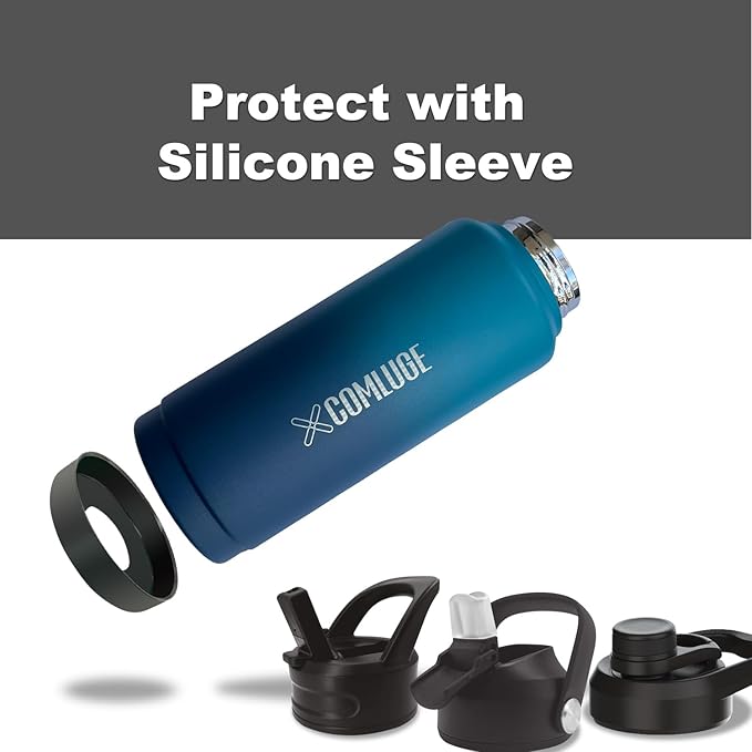blue 32 oz insulated water bottle with straw stainless steel water bottle,double wall,leak proof water bottles with 3 lids,travel,gym mens water bottle(Ocean Blue, 32oz)