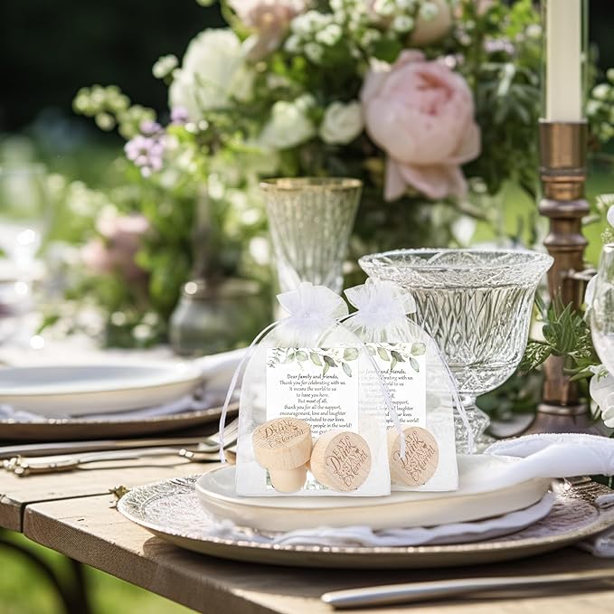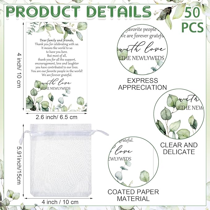 - Meaningful Design: the choice of wine cork as a gift is very creative, and the engraved words [Eat Drink & Stay Married] are stylish and very commemorative; The wedding thank you cards use green eucalyptus design, simple and generous in appearance