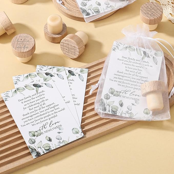 - Meaningful Design: the choice of wine cork as a gift is very creative, and the engraved words are stylish and very commemorative; The wedding thank you cards use green eucalyptus design, simple and generous in appearance