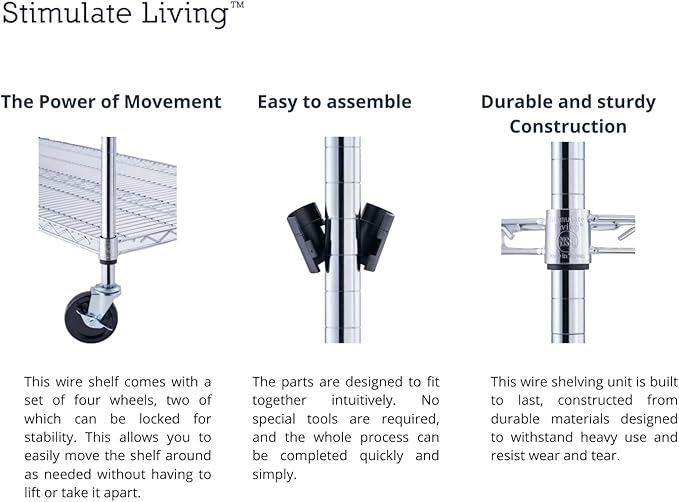 - â EASY ASSEMBLYâ Our Stimulate Living Wire Shelving is designed with simplicity in mind, making assembly quick and hassle-free. You can easily set it up in no time and start using it immediately.
