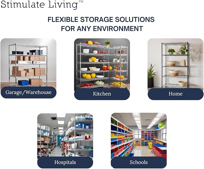 - â FLEXIBLE USAGEâ Our Stimulate Living Wire Shelving is designed to be flexible and adaptable to a wide range of settings. It can be used in warehouses to store heavy equipment, in kitchens to hold cooking utensils, in garages to organize tools, in hospitals and laboratories to store medical supplies, in offices to keep files and documents, in retail stores to display merchandise, in restaurants to store kitchenware, in factories to hold raw materials, and more.