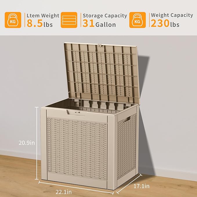 - 33 πππππ’π‘ πππ‘ππ₯π’π¨π¦ π¦π§π’π₯πππ πππ£ππππ§π¬ - This deck box offers ample space to accommodate both indoor and outdoor storage. With dimensions22.09"L*17.09"W*20.87"H,it will provide enough room to store all your belongings,perfect for large cushions,tools and pool supplies,etc