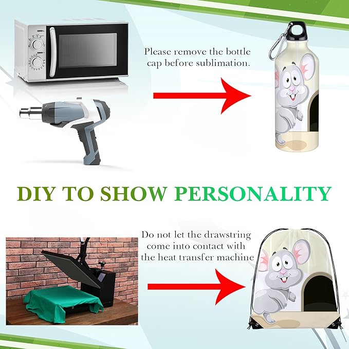 - DIY to Show Personality: the heat press travel sports bottles can withstand a temperature of 150℃ for 2-3 minutes (please remove the plastic hat before sublimating), while the gym string bags require printing temperatures of 130-140℃ for 5-6 seconds; Note: do not let the drawstring come into contact with the heat transfer machine