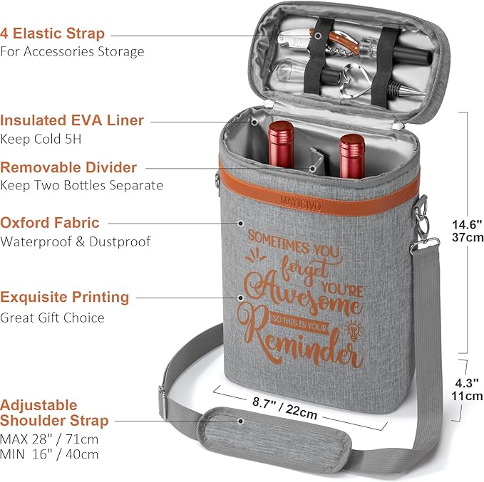 - CONSIDERATE DESIGN & MULTIFUNCTIONAL: MAYICIVO Insulated Wine Carrier Tote Bag (8.7’L x 4.3’W x 14.6’H) can hold 2 standard 750ML wine bottles or wine and tumblers at the same time. Interior removable divider keeps 2 bottles separate and avoid colliding. 4 elastic straps on the top designed for wine accessories storage. The removable adjustable shoulder strap (16" to 28") & comfort handle make it portable to carry wine for dinner, party, bar, picnic, camping, beach, travel or road trip