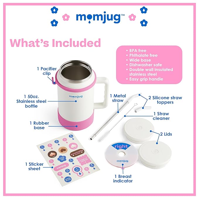 - The momjug water bottle with leak proof straw offers innovative features including a breast indicator to track breastfeeding sessions, a pacifier clip, and a tip-proof wide silicone base. Additional features include a metal straw with flexible silicone tip, straw cleaner, and ergonomic handle.