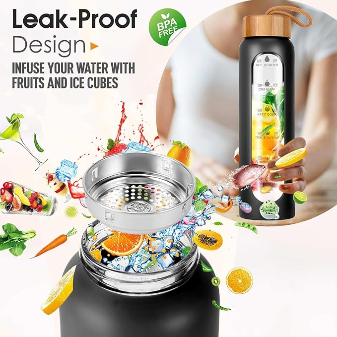 - Your Ultimate Hydration Partner: Our clear glass drinking bottle are made of borosilicate glass, which is dishwasher safe, leak proof, BPA, BPS, PVC, lead, and cadmium free. These durable and aesthetic reusable glass time water bottles will not crack under extreme temperature and pressure