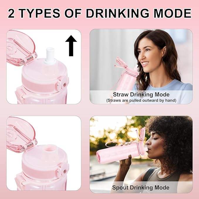 32 oz Water Bottle with Detachable Straw, Clear Motivational Water Bottles with Time to Drink, Tritan & BPA Free Sports Water Jug with Time Marker, Upgraded handle design, Rose Pink