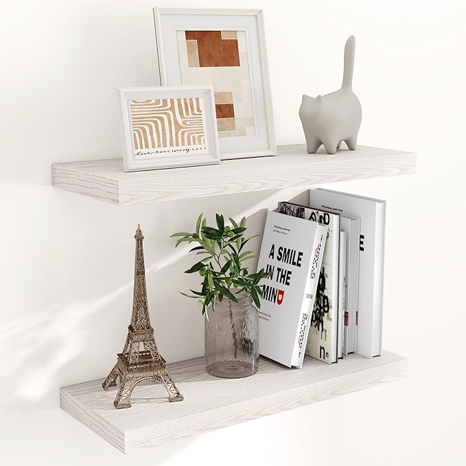 - 【DECORATIVE & FUNCTIONAL】The wall-mounted floating shelves are designed for decoration and storage, utilizing and decorating any space in your home. Used as shelf decor to show your collection, books, or prize, the hanging shelves are perfect for displaying your photo frame, small plants, model, or audio in your living room, office, study. And can also use as over the toilet storage shelf in the bathroom to hold toiletries or used as kitchen shelf to storage condiments.