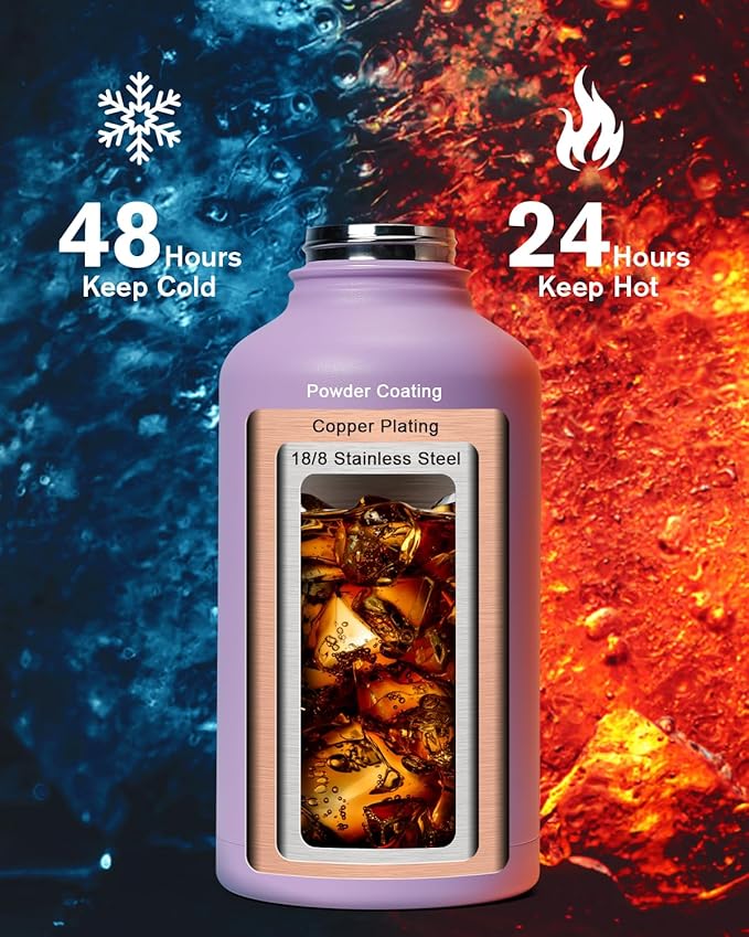 - Cold for 48H & Hot for 24H:Topre 64 oz Half Gallon Insulated Water Bottle features advanced double-wall vacuum insulation with copper plating, the water flask preserve the freshness and temperature of your drinks throughout the day.
