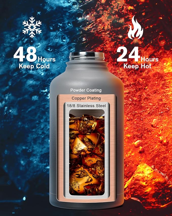 - Cold for 48H & Hot for 24H:Topre 64 oz Half Gallon Insulated Water Bottle features advanced double-wall vacuum insulation with copper plating, the water flask preserve the freshness and temperature of your drinks throughout the day.