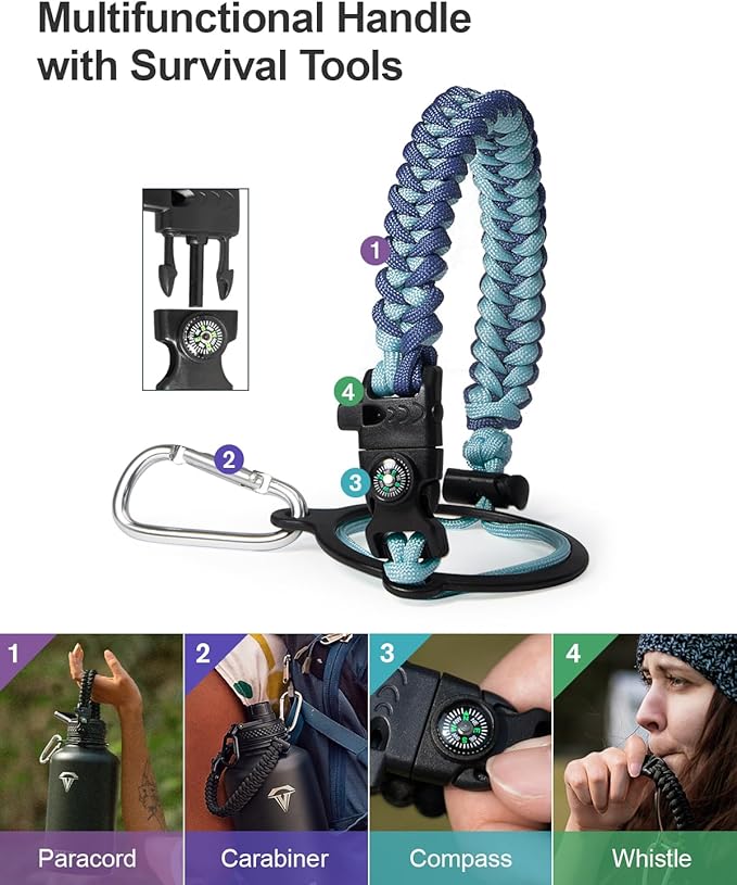 - Ready for adventures: The paracord handle is crafted from sturdy braided rope with an attached survival kit. This includes a compass, a whistle, and a clip, making it an ideal companion for any outdoor activity — be it camping,hiking or exploring new places through travelling.