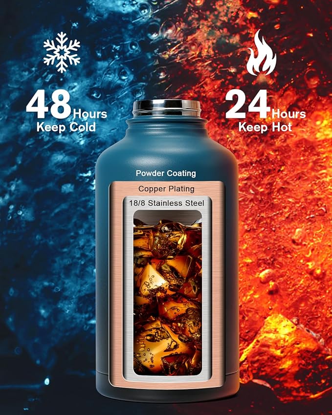 - Cold for 48H & Hot for 24H:Topre 64 oz Half Gallon Insulated Water Bottle features advanced double-wall vacuum insulation with copper plating, the water flask preserve the freshness and temperature of your drinks throughout the day.