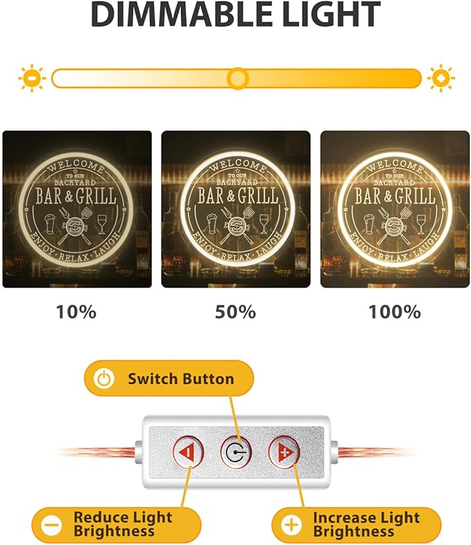 - âšă10-Level DimmableăCustomize your bar grill signs experience with our 10-level dimmable feature! Adjust the brightness of your neon sign to match your mood or ambiance. Whether you want a subtle glow or a bright, vibrant display, you can easily adjust it to your preference with our easy-to-use dimming controls.