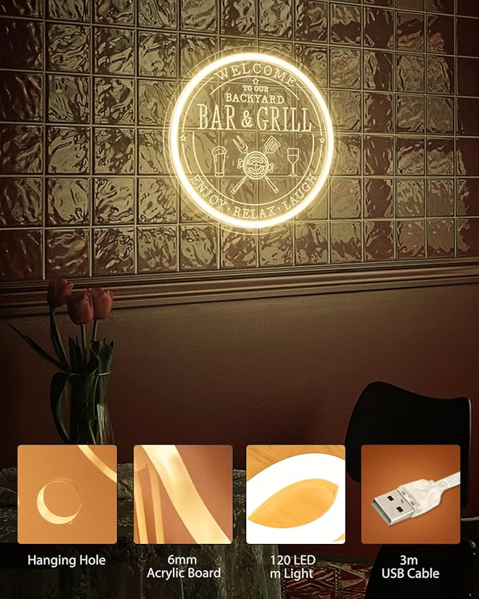 - đŸăPerfect Wall DecorăUse this bar and grill neon sign in your bar to create a unique atmosphere and make a wonderful addition. It's a really nice mood light and it definitely adds flavor to an otherwise plain space. This led bar sign can also be used to decorate many scenes, such as back yard, patio, poolside, bedroom, home pub, game room, man cave, BBQ party and so on.