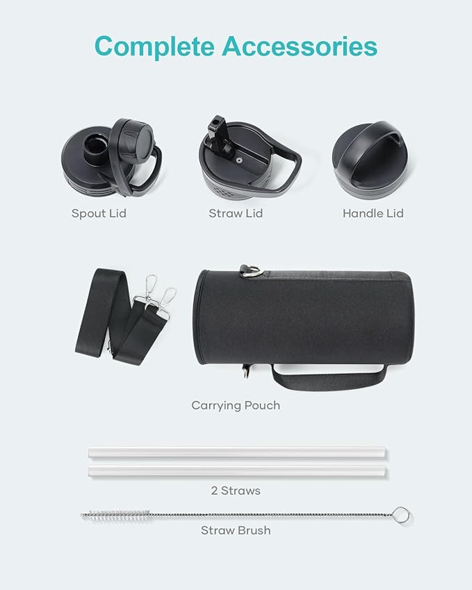 - Super Deal Combo: Buy 40oz insulated water flask, get 7 accessories. The pack includes 1 x carrying pouch, 3 x lids, 2 x straws, and 1 x straw cleaner. This bottle is ideal for camping, hiking, cycling, running, gym sessions, or outdoor work, ensuring you stay hydrated wherever you go.