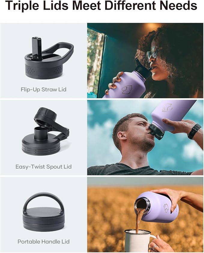 - 3 Caps Pack, 100% Leak-Proof: BUZIO stainless steel water bottle comes with 3 lids: portable handle lid, easy-twist spout lid, and flip-up straw lid to meet camping, hiking, cycling, fitness sports and more. Each lid has a thickened 360° seal for 100% leak-proof.
