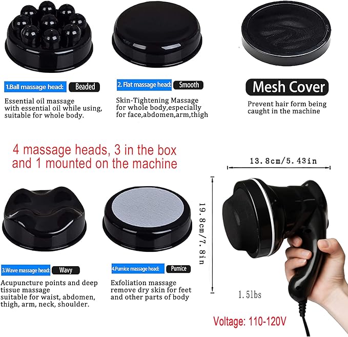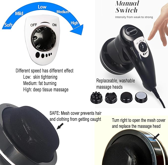 - 1.This handheld massager device combines a body massager, cellulite massager, body sculpting machine, lymphatic drainage massager, and skin tightener all in one. It utilizes vibration technology to provide you with deep tissue massage, fat massage, and skin-tightening massage. Not only does it help relieve muscle tension and promote lymphatic and blood circulation, but it also nurtures and smooths the skin surface of the abdomen, love handles, arms, legs, buttocks, and back.