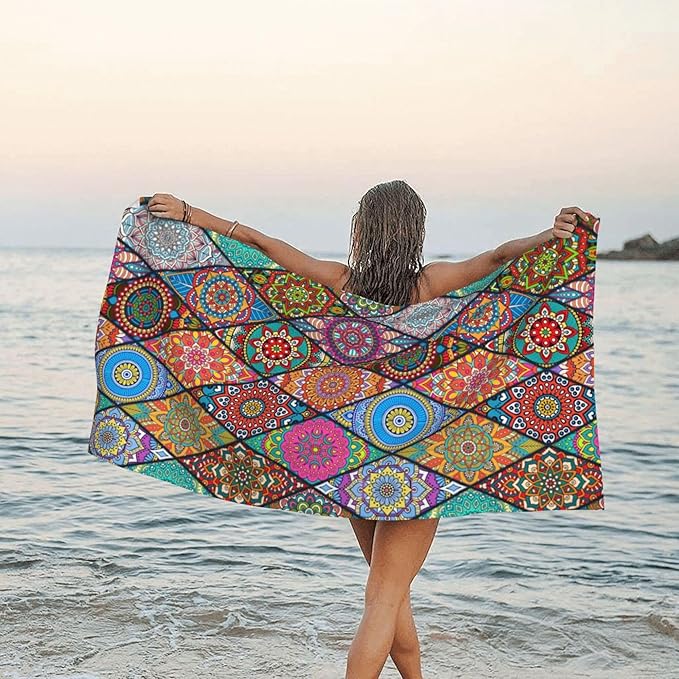 Beach Towel, Colorful Tribal Bohemian Mandala Beach Towel Oversized Sand Proof Absorbent, Quick-Dry Bath Pool Swim Towel for Shower Spa Vacation, 29.5” X 59”
