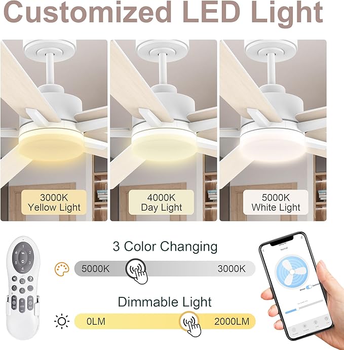 - 【Customized Color & Brightness】Lorpies ceiling fan with bright light transforms your space with 3 light modes: 3000K warm yellow light, 4000K bright daylight, and 5000K cool white light. Switch easily on the remote for relaxation,work,or entertainment. The dimmable and color-changing function can be adjusted from 0-100%, the 52 inch ceiling fan with light and remote creates perfect ideal for work,leisure,or parties. With a longer lifespan 2000 lumen fan is bright your master room enough.