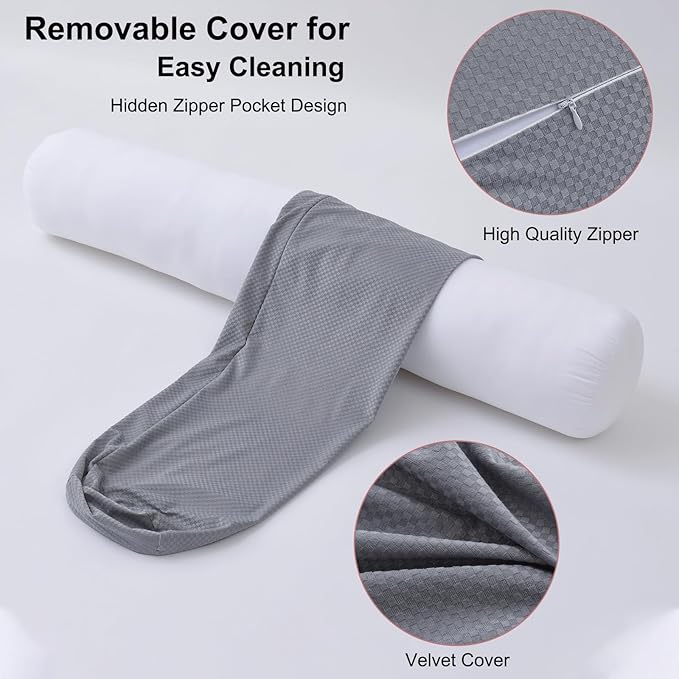 Body Roll Pillow for Adults, Bolster Pillow with Removable Velvet Cover, Long Round Cervical Maternity Pillow- 8” x 48”