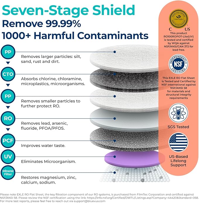 - SPACE-SAVING DESIGN AND YEARLY MAINTENANCE: The ROPOT-Lite(UV) is engineered for efficiency and convenience, offering 7-stage UV reverse osmosis system in a compact form, ideal for 1-2 people, and now supports easy filter replacement once annually. Certified by WQA against NSF/ANSI/CAN 372 for lead-free and tested by SGS, it ensures high water quality. Enjoy pure, healthy water that fits seamlessly into your living space.