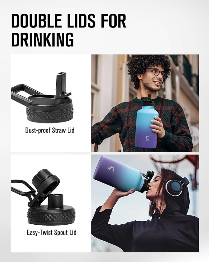 - Versatile Lid Combo: You can use the straw lid with just one hand, or use the spout lid for large gulps of drink. The large water bottle with two 100% leak-proof lids meets your all day needs.