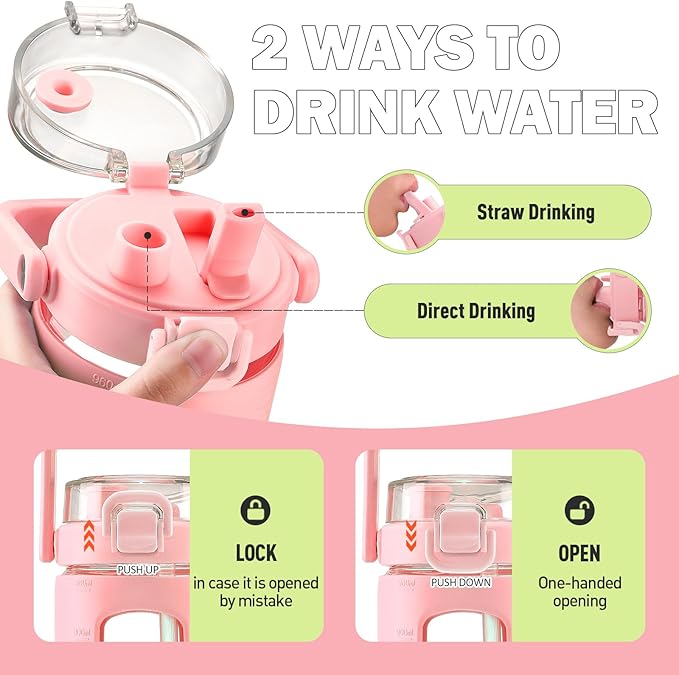 - 100% LEAKPROOF-The 32oz glass water bottle featured with pop up lid with premium safety lock, 100% leak-proof, and can be easily opened with one hand.The sport glass bottles equipped with a comfortable and firm handle and can be one-click lock to prevent any leak or spills by accident. Ideal for Sports and Fitness, It keeps you hydrated after your workout. A must for gym, fitness, camping, cycling, running, yoga and travel.