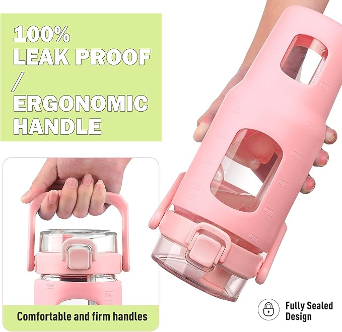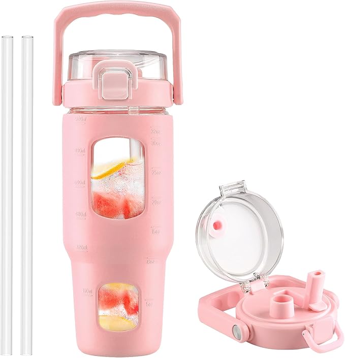 - UNIQUE DESIGN-This glass water bottle features a rotating grip handle and thick silicone sleeve, providing added protection and a secure grip. Crafted from thick borosilicate glass, it's ideal for home, office, or gym workout use. The sport bottle enables two ways to drink water with convenient straw lid, perfect for sipping on the go.