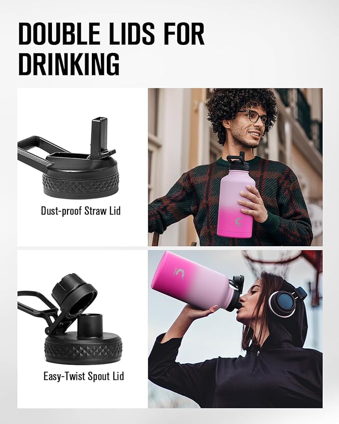 - Versatile Lid Combo: You can use the straw lid with just one hand, or use the spout lid for large gulps of drink. The large water bottle with two 100% leak-proof lids meets your all day needs.