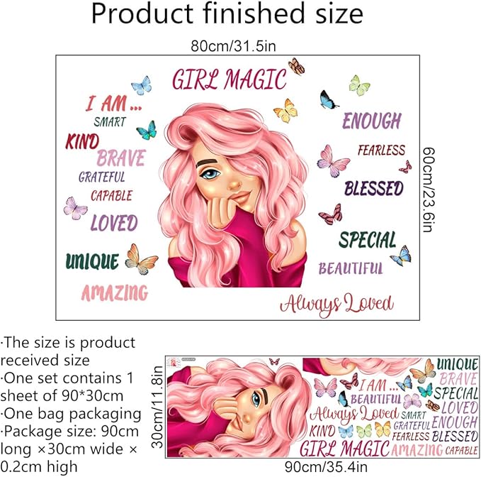 - 【Stylish Pattern】Inspirational girl wall decals, motivational words butterfly print art and modern design into an eye-catching mural. This sticker is very suitable for nursery, bedroom, playroom, living room, adorable kids room decor.