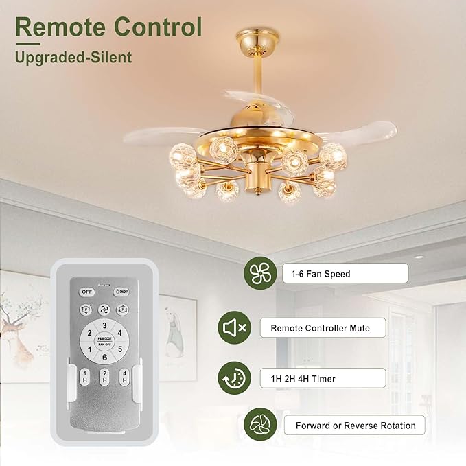 - Timing & Memory Function: Gold crystalceiling fan for bedroom has 3 timer setting (1H/2H/4H) and memory function, so you don't need to go through these tedious settings every time. In addition, sputnik fandelier ceiling light with fan operate with noise levels below 30dB, ensuring a comfortable and quiet space environment for you