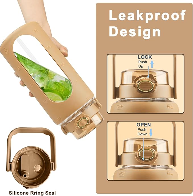 - 【A Motivational Water Bottle 】 Our half gallon glass water bottle with straw can hold 64oz of water, which is equivalent to the 8 cups of water recommended by scientists for humans to drink every day, helping you maintain moisture and drink enough water throughout the day.