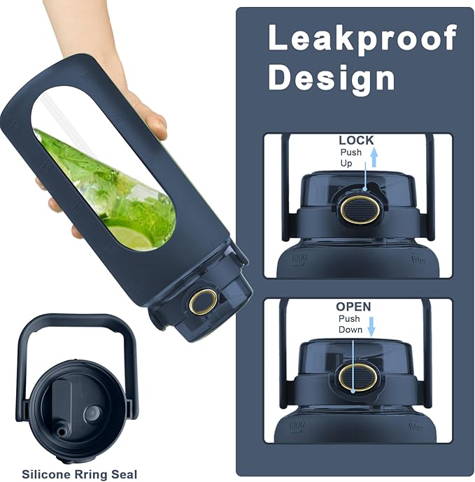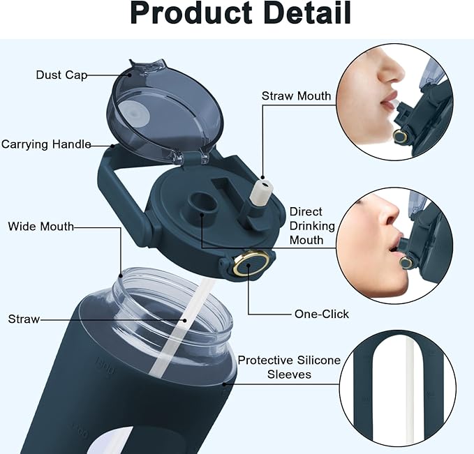 - 【Two Different Lids Design】 The two drinking methods are suitable for a variety of scenarios. A Flip-up straw lid can be used to easily drink water after exercise. This wide-mouth water jug can be taken for outdoor, sports, travel, picnic, and so on as motivational water bottles. We hope this glass water bottle can accompany you to more places you want to go.