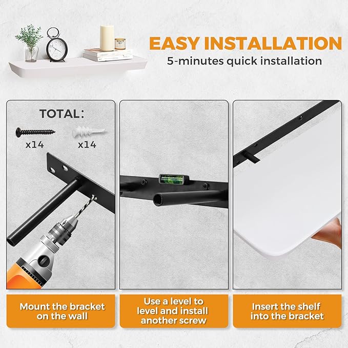 - Hidden Bracket Installation: Includes secure hidden steel brackets for a clean floating look. These easy-to-install shelves provide stability and a sleek, minimalist appearance