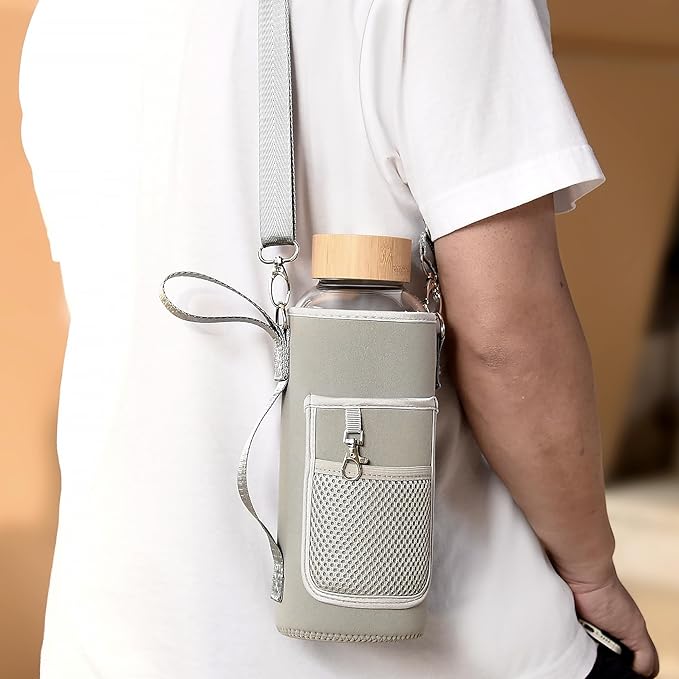 48 oz Sports Borosilicate Glass Water Bottle with Bamboo Lid with Neoprene Sleeve