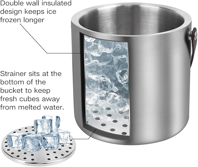 - BUY WITH CONFIDENCE: Our ice buckets ice containers come with every accessory needed: lid, tong and strainer. First, the airtight lid with silicone-ring making tight fit to insulate warm air and keep ice frozen for a longer time. Second, the ice tong is helpful to grip cubes into beverage drink when you need a little ice. Last, the strainer/bottom piece separates ice and melted water so that the cubes stay solid longer