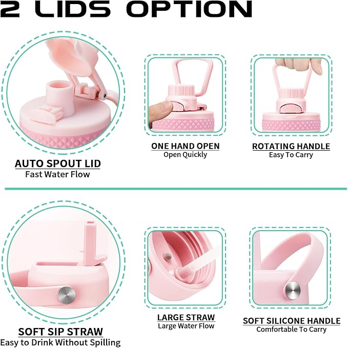 - 2 LIDS—100% Leak Proof: the auto spout cap & straw lid provide your different drinking experience. The ONE-HAND operation pop-up spout lid for convenient enjoy your fast water flow. The SPILL-PROOF straw lid with high flow rate & BPA free. Both 2 lids design with a sturdy handle, making the thermo water bottle more convenient to carry