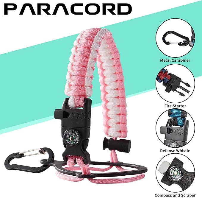 - UNIQUE PARACORD—Perfect Accessories: bright color paracord matches the flask water bottles to give you a youthful vibe while adding a personal style. It comes with a compass, safety loop, metal carabiner, flint, igniter, and whistle to become your survival tool for your wild adventures