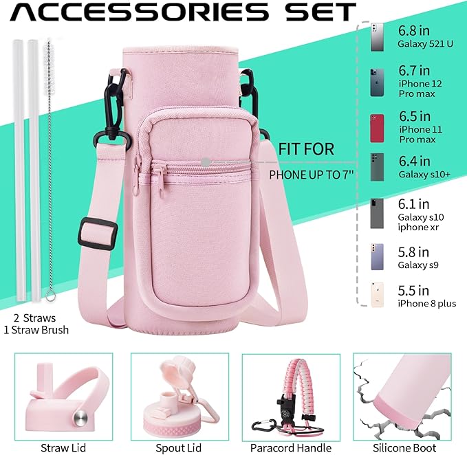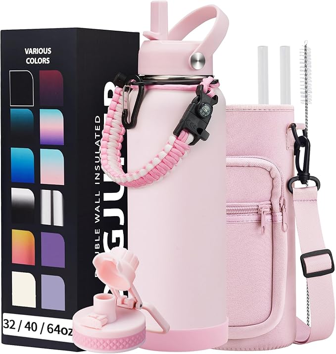 - COMBO—Super Deal: Buy 40oz insulated water bottles and get 9 accessories (2 x lids, 1 x survival paracord, 1 x carrying pouch, 1 x shoulder strap, 1 x protective cup mat, 2 x straws, 1 x straw brush). WITH A LIFETIME GUARANTEE, these metal water bottles are the perfect gift for use at home, work, school, road trips, hiking, sporting events, or just hanging out