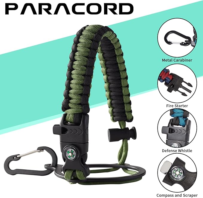- UNIQUE DESIGNS PARACORD HANDLE: Full-function paracord handle made in individual styles to match the color of the flask water bottles. With compass, safety ring, carabiner, flint fire starter & whistle. It unravels into a sturdy and taut rope in an emergency, making the large water jug an ideal survival kit for expeditions in the wild