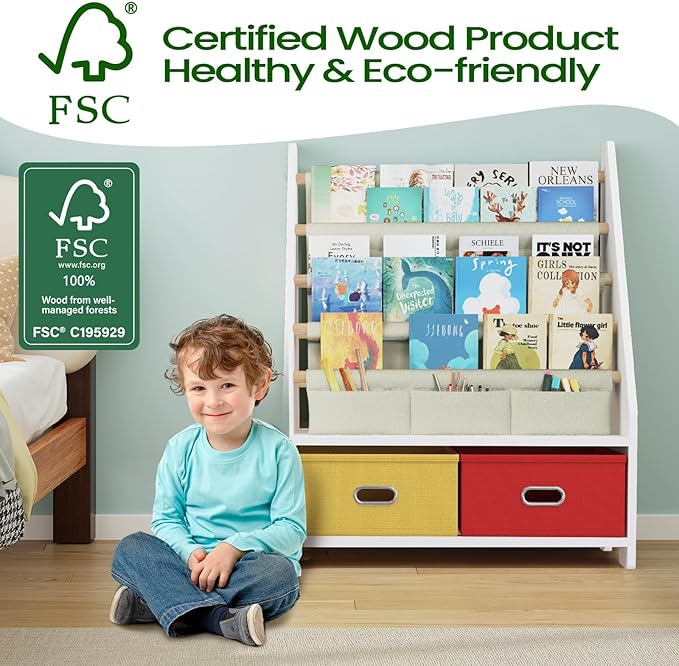 - CHILD-FRIENDLY DETAILING: All solid wood material of this kids book shelf is hand-made and polished, careful polishing of edges and corners, sleek edges and rounded corners minimize the risk of bumping or scratching. The sling bookshelf adopts stronger and wear-resistant cotton linen canvas for durable and attractive.A great toy and book organizer for kids, boys, girls, toddlers and children.