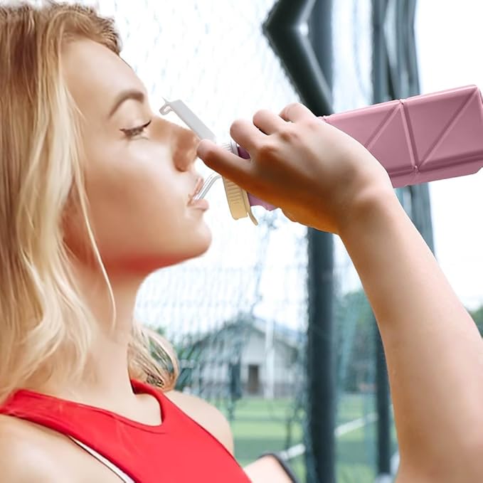 620ml Silicone Foldable Water Bottle with Straw Lid - Lightweight, Reusable, & Leakproof for Travel, Camping, Hiking, & Sports (PINK)