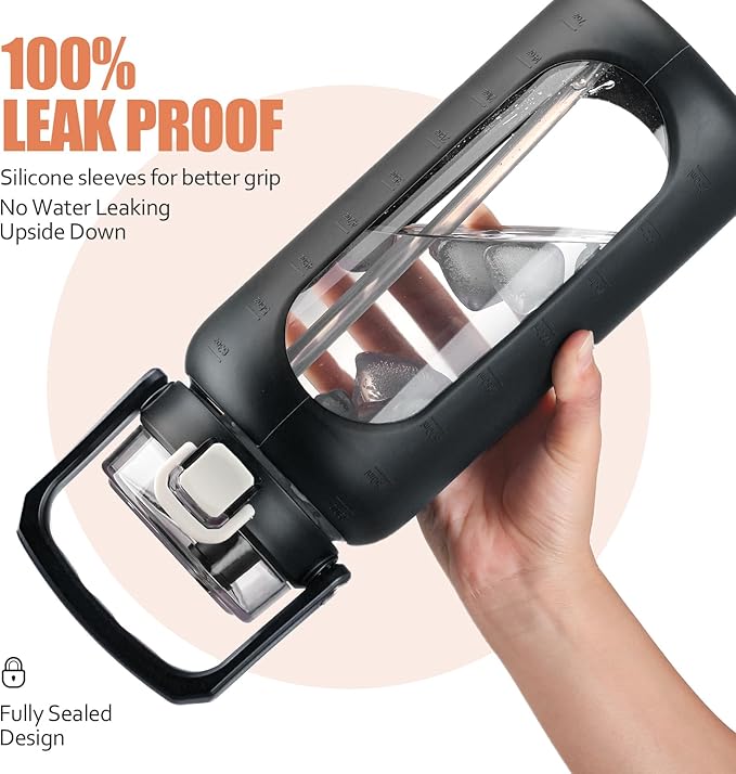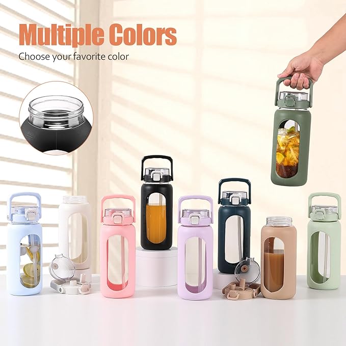- LARGE CAPACITY WITH TIME MARKER: BLUEGO glass bottle has 64oz capacity with rubber sleeve TIME MARKER and water capacity markers. The clear and see-through window help you to track the amount of water you drink, always keeping you hydrated. Meanwhile the water bottle lid with a sealing cap that effectively prevents any leakage.