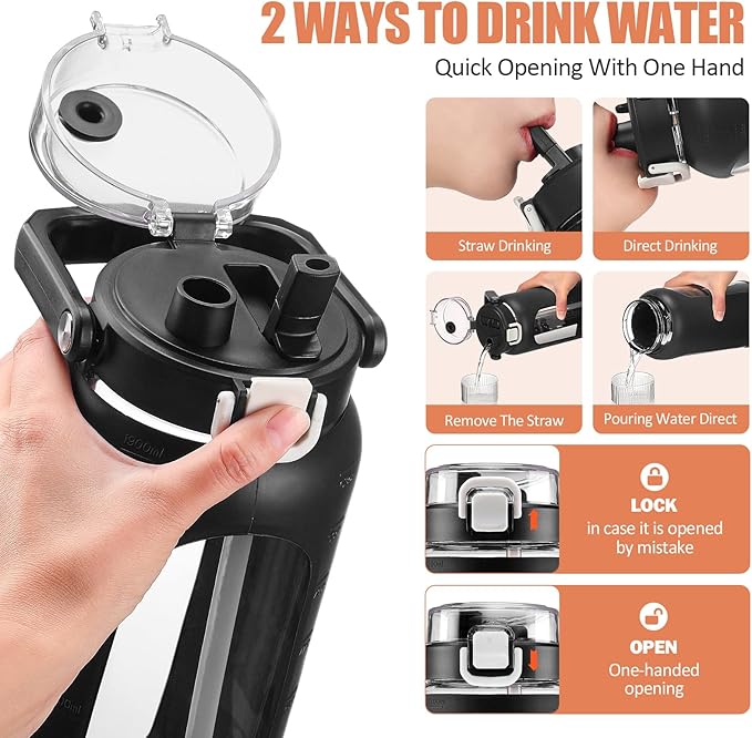 - 2 WAYS TO DRINK: BLUEGO 64oz sports water bottle features POP-UP lid with ONE-CLICK SAFETY LOCK and a covered DUSTPROOF CAP to keep hygienic and better leakproof effect. The 2-IN-1 STRAW LID enables the water bottle two way to drink: spillproof sip by a built-in flip straw or direct drink through chug mouth, both are convenient and ergonomic.