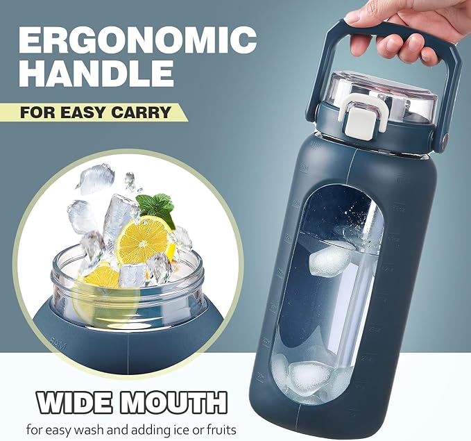 - EASY TO CARRY: BLUEGO 64oz Water Bottle comes with a portable TOP HANDLE with wave design to provide more secure grip, also with a non-slip silicone sleeve to avoid hand slippage or slight bump. Easy to hold and carry makes it perfect companion to take it on the go. The one-handed safety lock and dustproof cap can be easily opened and closed, convenient for you to drink at any time.